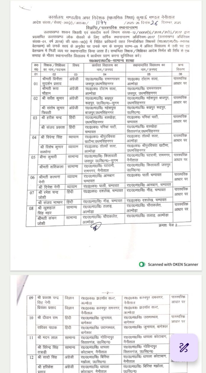 उत्तराखंडHaldwani कुमाऊं में एलटी शिक्षकों के तबादले, देखें सूची By समाचार शगुन डेस्क - December 27, 2025 0 105 FacebookTwitterPinterestWhatsApp समाचार शगुन हल्द्वानी उत्तराखंड कुमाऊं में एलटी शिक्षकों में भारी फेरबदल किया गया है। मंडलीय अपर निदेशक एसपी सेमवाल ने तबादला सूची जारी कर दी है। इसमें 26 शिक्षकों के तबादले किए गए हैं।
