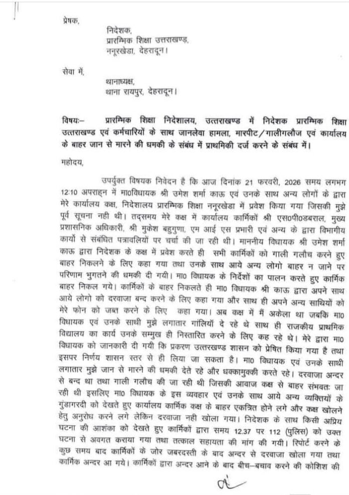 उत्तराखंड प्राथमिक शिक्षा निदेशालय में प्राथमिक शिक्षा निदेशक अजय नौडियाल के साथ हुई मारपीट मामले में पुलिस ने मुकदमा दर्ज कर लिया है। अजय नौडियाल ने इस मामले में रायपुर में तहरीर दी थी। उसी तहरीर का आधार पर पुलिस ने बीजेपी विधायक उमेश शर्मा काऊ और उनके समर्थकों पर मुकदमा दर्ज किया गया है। अजय नौडियाल ने तहरीर में विधायक उमेश शर्मा काऊ और उनके साथ आए लोगों पर कार्यालय में घुसकर मारपीट करने, गाली-गलौज, तोड़फोड़ और जान से मारने की धमकी देने का आरोप लगाया है। अजय नौडियाल की तहरीर का अनुसार शनिवार 21 फरवरी दोपहर करीब 12.10 बजे विधायक उमेश शर्मा काऊ अपने समर्थकों के साथ बिना सूचना के ननूरखेड़ा स्थित प्राथमिक शिक्षा निदेशालय पहुंचे और सीधे उनके कक्ष में प्रवेश कर गये‌।