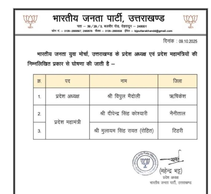 उत्तराखंड भाजयुमो ने इस युवा को बनाया प्रदेश अध्यक्ष By समाचार शगुन डेस्क - October 9, 2025 0 213 FacebookTwitterPinterestWhatsApp समाचार शगुन उत्तराखंड भारतीय जनता पार्टी के प्रदेश अध्यक्ष महेंद्र भट्ट ने बृहस्पतिवार 9 अक्टूबर को भाजयुमो के प्रदेश अध्यक्ष व महामंत्री पद पर नये युवाओं को अवसर दिया है।