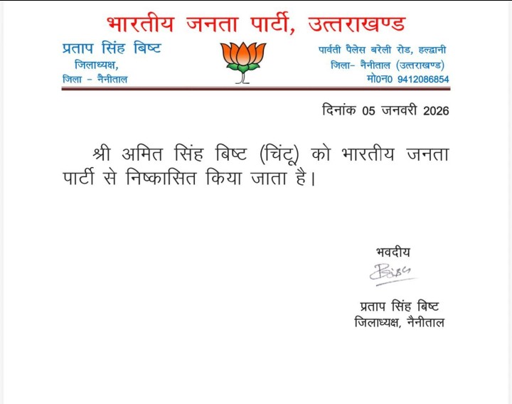 हल्द्वानी में युवक की गोली मारकर हत्या करने के आरोपी वार 55 रामपुर रोड के पार्षद और भाजपा मंडल उपाध्यक्ष अमित बिष्ट को भारतीय जनता पार्टी ने निष्कासित कर दिया है। इस संबंध में पार्टी जिलाध्यक्ष प्रताप बिष्ट की ओर से पत्र जारी किया गया है।