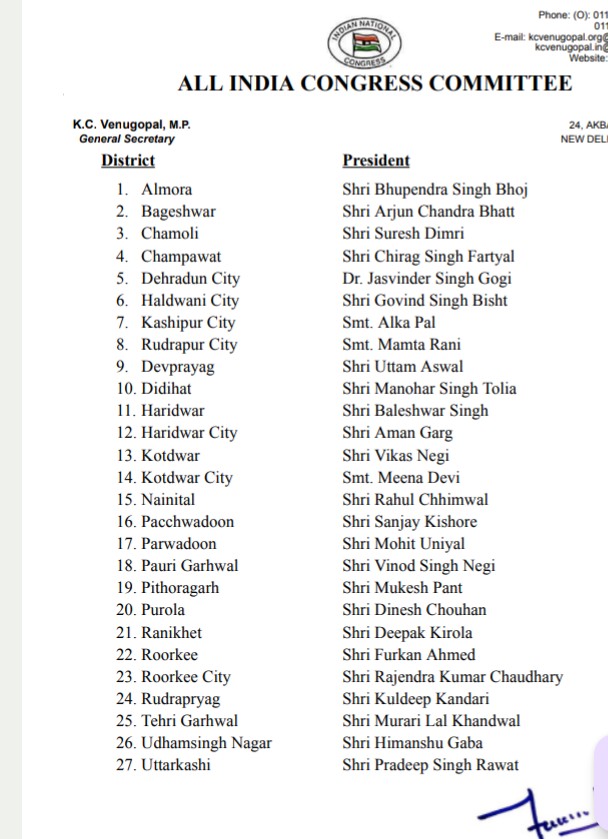 कांग्रेस ने नैनीताल, अल्मोड़ा जिला समेत 27 अध्यक्ष घोषित किए, देखें सूची