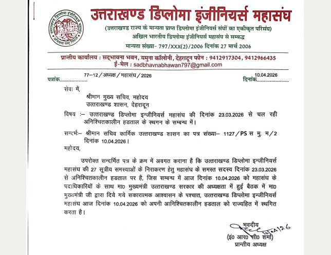 उत्तराखंडHaldwani डिप्लोमा इंजीनियरों की अनिश्चितकालीन हड़ताल स्थगित, देखें आदेश By समाचार शगुन डेस्क - April 10, 2026 0 56 FacebookTwitterPinterestWhatsApp समाचार शगुन हल्द्वानी उत्तराखंड उत्तराखंड डिप्लोमा इंजीनियर्स महासंघ के बैनर तले चल रही अनिश्चितकालीन हड़ताल 18वें दिन शासन स्तर पर वार्ता के बाद स्थगित कर दी गई है।
