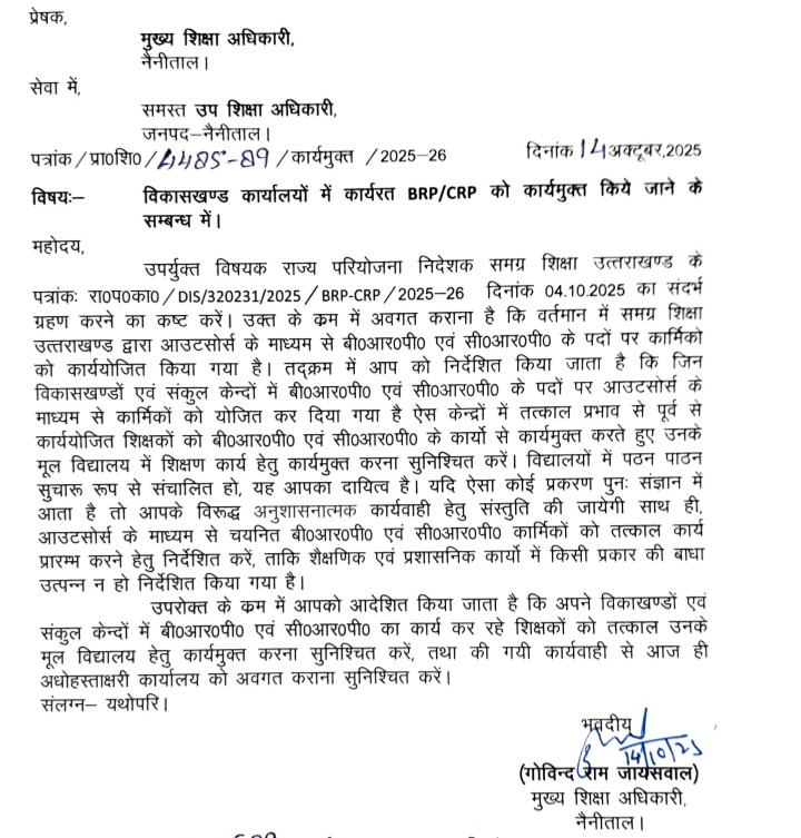 उत्तराखंडHaldwani शिक्षकों को राहत, इन पदों से किया कार्यमुक्त, आदेश जारी By समाचार शगुन डेस्क - October 14, 2025 0 209 FacebookTwitterPinterestWhatsApp समाचार शगुन हल्द्वानी उत्तराखंड मुख्य शिक्षा अधिकारी गोविंद राम जायसवाल ने मंगलवार 14 अक्टूबर को आदेश जारी कर विकासखंडों में बीआरपी व सीआरपी के पद से शिक्षकों को कार्यमुक्त कर दिया है। साथ ही शिक्षकों को मूल विद्यालय में भेजने के निर्देश दिए हैं।