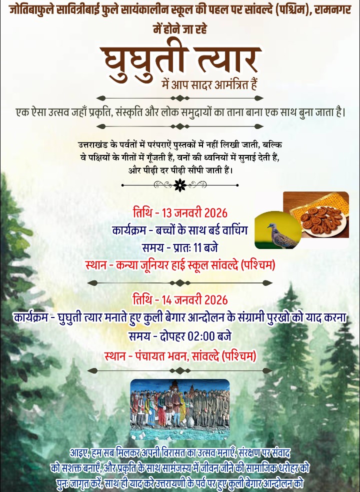 सावित्रीबाईफुले सायंकालीन स्कूल की पहल पर सांवल्दे (पश्चिम),रामनगर में दो दिवसीय घुघुती त्यार कार्यक्रम होगा। यह जानकारी कार्यक्रम आयोजक नवेंदु मठपाल ने दी। मठपाल के अनुसार यह एक ऐसा उत्सव है जहाँ प्रकृति, संस्कृति और लोक समुदायों का ताना बाना एक साथ बुना जाता है। उत्तराखंड के पर्वतों में परंपराऐं पुस्तकों में नहीं लिखी जाती, बल्कि वे पक्षियों के गीतों में गूँजती हैं, वनों की ध्वनियों में सुनाई देती हैं, और पीढ़ी दर पीढ़ी सौंपी जाती हैं। इस अवसर पर 13 जनवरी को प्रातः 11 बजे से कन्या जूनियर हाई स्कूल सांवल्दे (पश्चिम) के नजदीक बच्चों के साथ बर्ड वाचिंग की जाएगी. जबकि 14 जनवरी को स्थानीय ग्रामवासियों के साथ घुघुती त्यार मनाते हुए पंचायत भवन, सांवल्दे (पश्चिम) में कुली बेगार आन्दोलन के संग्रामी पुरखो को याद किया जाएगा