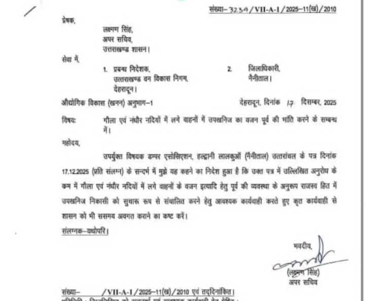 उत्तराखंडHaldwani गौला नदी में खनन को लेकर नया आदेश जारी By समाचार शगुन डेस्क - December 18, 2025 0 257 FacebookTwitterPinterestWhatsApp समाचार शगुन हल्द्वानी उत्तराखंड शासन ने गौला और नंधौर नदी में खनन को लेकर नया आदेश जारी किया है। उपखनिज वाहनों के वजन को लेकर पुरानी व्यवस्था बहाल की गई है। इस संबंध में गुरुवार को अपर सचिव लक्ष्मण सिंह ने आदेश जारी किए हैं।