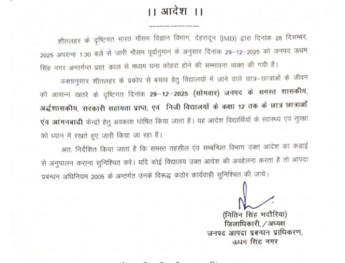 उत्तराखंड ठंड के चलते इस जिले में स्कूलों की छुट्टी, देखें आदेश By समाचार शगुन डेस्क - December 29, 2025 0 144 FacebookTwitterPinterestWhatsApp समाचार शगुन हल्द्वानी उत्तराखंड मैदानी क्षेत्रों में लगातार बढ़ते घने कोहरे और शीत लहर के चलते ऊधमसिंहनगर जिले में 29 दिसंबर को कक्षा एक से 12वीं तक के स्कूलों में छुट्टी घोषित कर दी गई है। इस संबंध में जिलाधिकारी ने आदेश जारी किए हैं।