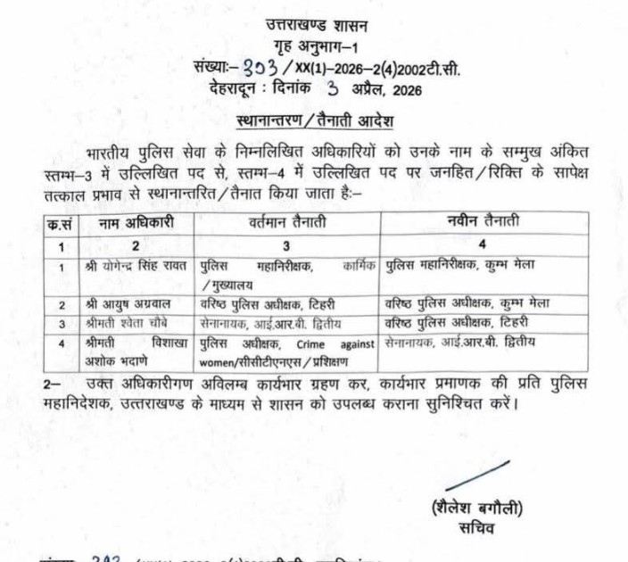 उत्तराखंड आईपीएस अफसरों के तबादले, टिहरी में इन्हें कप्तान बनाया By समाचार शगुन डेस्क - April 3, 2026 0 111 FacebookTwitterPinterestWhatsApp समाचार शगुन उत्तराखंड उत्तराखंड गृह सचिव शैलेश बगौली ने आईपीएस अफसरों की स्थानांतरण सूची जारी की है। इसमें टिहरी जिले का कप्तान भी बदला गया है।