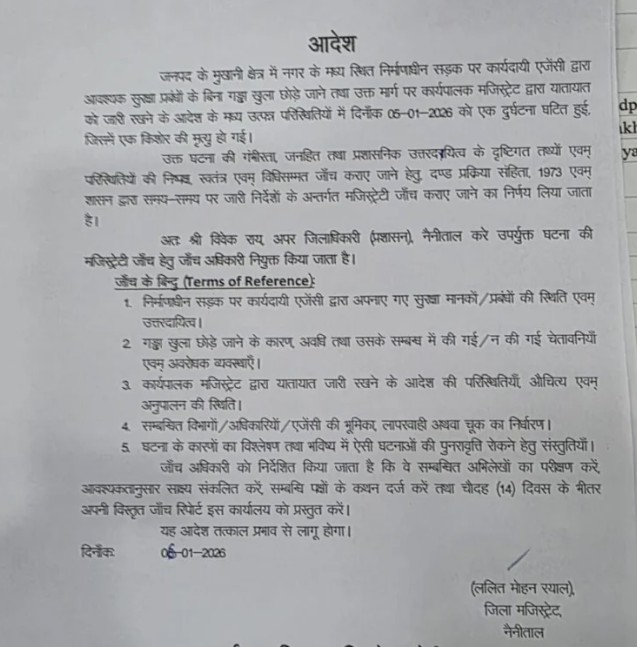 जिलाधिकारी ललित मोहन रयाल ने बीते सोमवार की शाम मुखानी क्षेत्र में सड़क के गड्ढे से हुई मासूम की मौत के मामले का तत्काल संज्ञान लेते हुए घटना को गंभीर मांगते हुए मजिस्ट्रेटी जांच के निर्देश दिए है। इस मामले में एडीएम विवेक राय को जांच अधिकारी नियुक्त किया है।