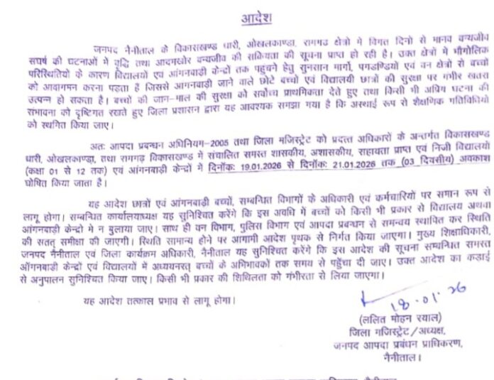 उत्तराखंडHaldwani नैनीताल जिले में यहां तीन दिन स्कूलों की छुट्टी घोषित By समाचार शगुन डेस्क - January 18, 2026 0 150 FacebookTwitterPinterestWhatsApp समाचार शगुन हल्द्वानी उत्तराखंड नैनीताल जिले के रामगढ़, धारी और ओखलकांडा के स्कूलों और आंगनबाड़ी केंद्रों में जिलाधिकारी ने 19 जनवरी से 21 जनवरी तक अवकाश घोषित कर दिया है।