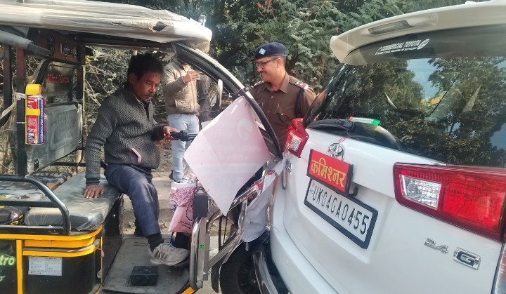 हल्द्वानी में मुखानी नहर कवरिंग रोड पर निरीक्षण को पहुंचे कुमाऊं कमिश्नर दीपक रावत की इनोवा को ई-रिक्शा चालक ने टक्कर मार दी। मौके पर मौजूद पुलिस ने शराब के नशे में धुत चालक को हिरासत में ले लिया। टक्कर के दौरान कमिश्नर वाहन में ही बैठे थे। कमिश्नर मंगलवार की दोपहर बीते दिन सड़क हादसे में मारे गये मासूम की मौत के बाद सड़क का जायजा लेने आए थे।