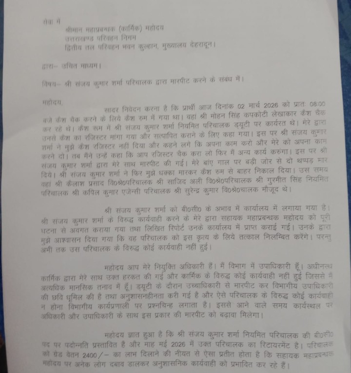 नैनीताल जिले के रामनगर डिपो में सोमवार तीन मार्च को परिचालक के द्वारा वरिष्ठ स्टेशन प्रभारी रामनगर के साथ मारपीट व अभद्रता की गई। इसकी सूचना सहायक महाप्रबंधक रामनगर, मंडलीय प्रबंधक संचालक काठगोदाम को की गई लेकिन प्रबंधन की ओर से परिचालक के खिलाफ कोई कार्यवाही नहीं की गई। संज्ञान में आया है कि उक्त प्रकरण को दबाने का प्रयास किया जा रहा है।