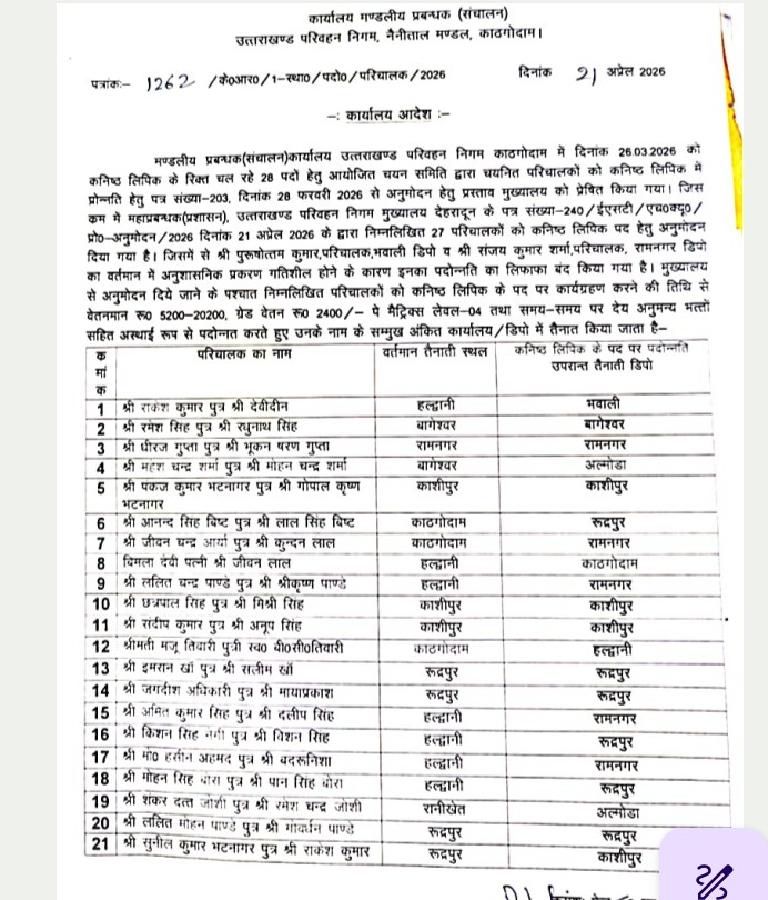 उत्तराखंडHaldwani रोडवेज के 27 कंडक्टरों का प्रमोशन, देखें सूची By समाचार शगुन डेस्क - April 21, 2026 0 138 FacebookTwitterPinterestWhatsApp समाचार शगुन हल्द्वानी उत्तराखंड उत्तराखंड परिवहन निगम में काठगोदाम रीजन की आरएम संचालन पूजा जोशी ने कुमाऊं के 27 परिचालकों को लिपिक पद पर प्रमोशन दिया गया है। इस संबंध में सोमवार को सूची जारी कर दी गई है।