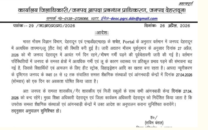 उत्तराखंड इस जिले में बढ़ती गर्मी और लू के मद्देनजर 27 अप्रैल को स्कूलों की छुट्टी, देखें आदेश By समाचार शगुन डेस्क - April 26, 2026 0 163 FacebookTwitterPinterestWhatsApp समाचार शगुन हल्द्वानी उत्तराखंड गर्मी के बढ़ते प्रकोप और लू की संभावना को देखते हुए जिलाधिकारी देहरादून सविन बंसल ने सोमवार 27 अप्रैल को कक्षा एक से 12वीं तक कू स्कूलों में अवकाश घोषित कर दिया है।