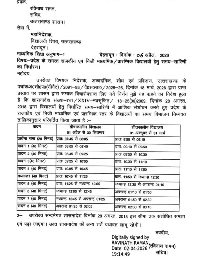उत्तराखंड स्कूलों की समय-सारिणी तय, शासन ने जारी किए आदेश By समाचार शगुन डेस्क - April 6, 2026 0 179 FacebookTwitterPinterestWhatsApp समाचार शगुन हल्द्वानी उत्तराखंड शासन ने प्रदेश में सरकारी और प्राइवेट स्कूलों की समय-सारणी में बदलाव किया है। इस संबंध में छह अप्रैल सोमवार को शिक्षा सचिव की ओर से आदेश जारी किए गए हैं।