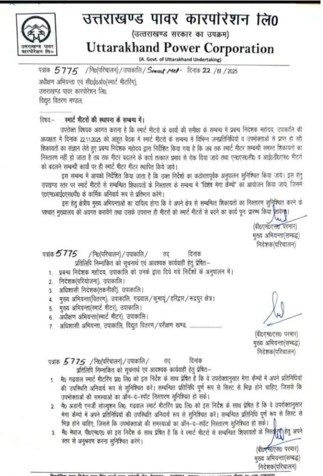 प्रदेश में स्मार्ट मीटरों को लेकर लगातार मिल रही शिकायतों के बाद यूपीसीएल ने बड़ा फैसला लिया है। यूपीसीएल के प्रबंध निदेशक, उपाकालि की अध्यक्षता में 22 नवंबर 2025 को हुई समीक्षा बैठक में निर्देश जारी किए गए कि जब तक स्मार्ट मीटरों से जुड़ी सभी शिकायतें पूरी तरह निस्तारित नहीं हो जातीं, तब तक मीटर बदलने का कार्य तत्काल प्रभाव से रोक दिया। इस संबंध में यूपीसीएल के मुख्य अभियंता ने प्रदेश भर के अधिशासी अभियंताओं को निर्देश दिए हैं।