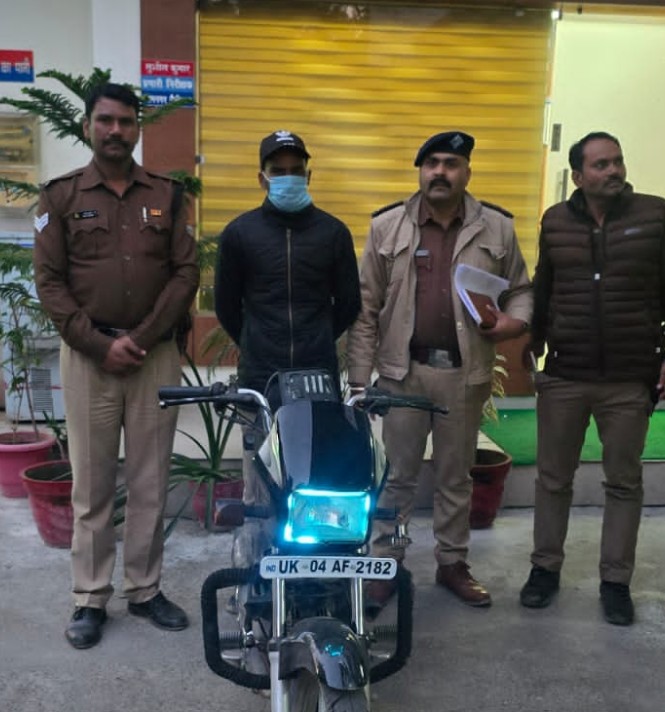 पुलिस अधीक्षक हल्द्वानी श्री मनोज कत्याल के मार्गदर्शन क्षेत्राधिकारी रामनगर श्री सुमित पांडे के पर्यवेक्षण तथा प्रभारी निरीक्षक कोतवाली रामनगर श्री सुशील कुमार के नेतृत्व में गठित पुलिस टीम द्वारा कड़ी मेहनत पतारसी /सुरागरसी व सूझ बूझ तथा सफल पुलिसिंग का परिचय देते हुए *अभियुक्त आशू निवासी छतरी चौराहा भवानीगंज रामनगर नैनीताल को *चोरी की गई उपरोक्त मोटरसाइकिल संग* रामनगर भवानीगंज में निगम के खाली मैदान से *गिऱफ्तार किया गया।