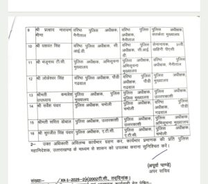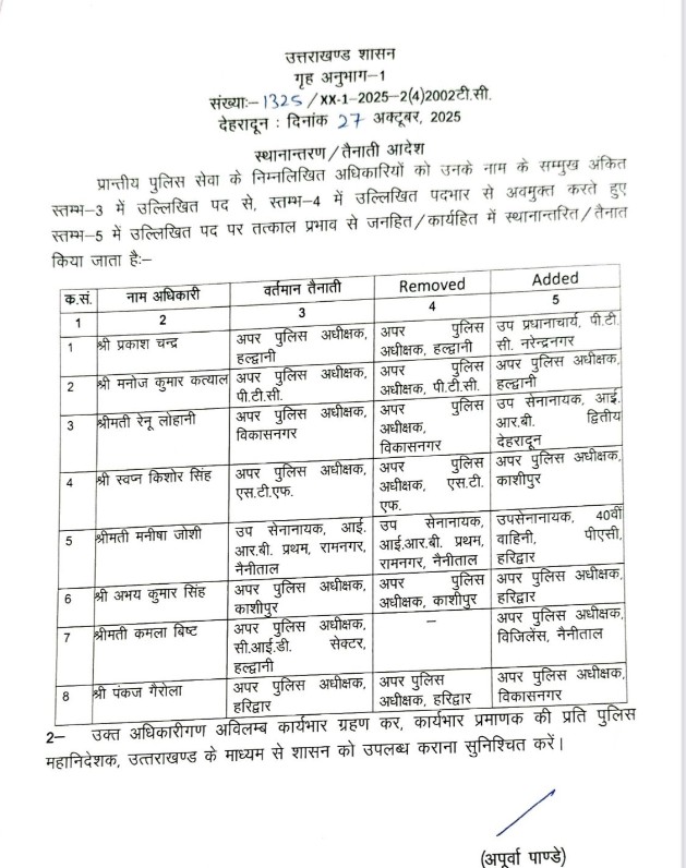 उत्तराखंड आईपीएस अधिकारियों के तबादले, नैनीताल एसएसपी भी बदले By समाचार शगुन डेस्क - October 27, 2025 0 384 FacebookTwitterPinterestWhatsApp समाचार शगुन हल्द्वानी उत्तराखंड शासन ने सोमवार 27 अक्टूबर की देर शाम आईपीएस अधिकारियों के तबादले किए हैं। नैनीताल जिले के एसएसपी पीएंन मीणा का तबादला किया गया है जबकि मंजूनाथ टीसी को नैनीताल का वरिष्ठ पुलिस अधीक्षक बनाया गया है।