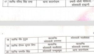 उत्तराखंडHaldwani हल्द्वानी कोतवाल समेत 20 दरोगाओं के तबादले, देखें सूची By समाचार शगुन डेस्क - December 4, 2025 0 103 FacebookTwitterPinterestWhatsApp समाचार शगुन हल्द्वानी उत्तराखंड नैनीताल जिले में एसएसपी मंजूनाथ टीसी ने बुधवार की देर रात चार इंस्पेक्टरों व 16 दरोगाओं के तबादले किए हैं। हल्द्वानी कोतवाल, बनभूलपुरा व मुखानी थानाध्यक्ष का भी तबादला किया गया है।