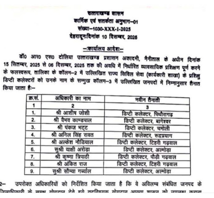 उत्तराखंड ट्रेनिंग के बाद नौ डिप्टी कलेक्टरों को इन जिलों में मिली तैनाती, देखें सूची By समाचार शगुन डेस्क - December 11, 2025 0 143 FacebookTwitterPinterestWhatsApp समाचार शगुन उत्तराखंड उत्तराखंड में नौ डिप्टी कलेक्टर को ट्रेनिंग के बाद तैनाती दे दी गई है। इस संबंध में शासन के कार्मिक और सतर्कता विभाग ने सूची जारी कर दी है।