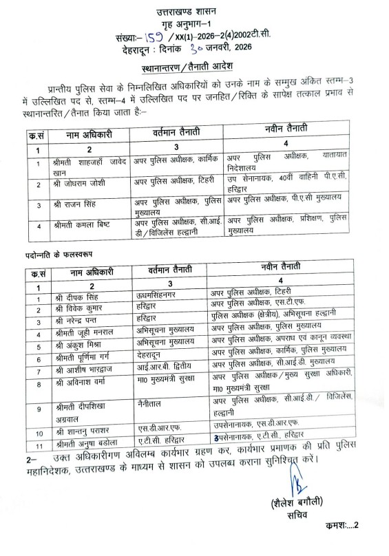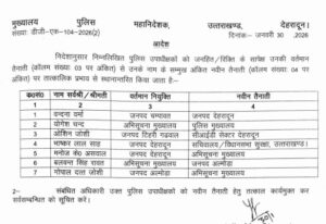 उत्तराखंडHaldwani एसपी और सीओ के तबादले, देखें सूची By समाचार शगुन डेस्क - January 30, 2026 0 223 FacebookTwitterPinterestWhatsApp समाचार शगुन हल्द्वानी उत्तराखंड प्रदेश में पुलिस अधिकारियों के तबादले हुए हैं। इस संबंध में शुक्रवार की देर शाम सूची जारी की गई है। ko
