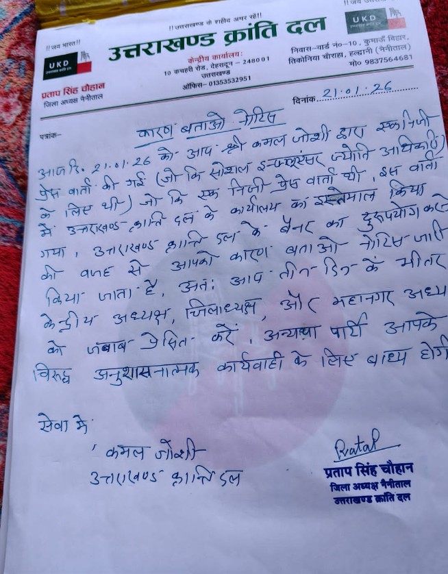 उत्तराखंडHaldwani यूकेडी में ब्लागर ज्योति अधिकारी को लेकर बखेड़ा By समाचार शगुन डेस्क - January 21, 2026 0 93 FacebookTwitterPinterestWhatsApp समाचार शगुन हल्द्वानी उत्तराखंड हल्द्वानी में बुधवार को ब्लागर ज्योति अधिकारी की यूकेडी के बैनर तले प्रेस वार्ता कराने को लेकर नया विवाद खड़ा हो गया है। इस मामले में यूकेडी जिलाध्यक्ष प्रताप सिंह चौहान ने कारण बताओ नोटिस जारी किया है।
