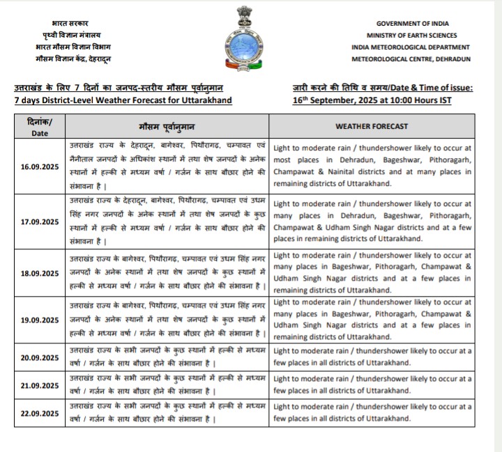 उत्तराखंडHaldwani मौसम विभाग ने जारी किया अलर्ट, देखें कितने दिन होगी बारिश By समाचार शगुन डेस्क - September 16, 2025 0 211 FacebookTwitterPinterestWhatsApp समाचार शगुन हल्द्वानी उत्तराखंड मौसम विज्ञान केंद्र देहरादून की ओर से 16 सितंबर मंगलवार से 22 सितंबर सोमवार तक का पूर्वानुमान जारी किया है। इसमें नैनीताल, पिथौरागढ़ समेत अन्य जिलों में बारिश की आशंका जताई गई है है।