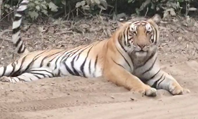 नैनीताल जिले में सुप्रसिद्ध रामनगर कार्बेट से वन्यजीवों के आए दिन रोमांचित करने वाली तस्वीरें सामने आती रही हैं। पिछले दिनों हाथियों के झुंड के नदी पार करने का वीडियो सोशल मीडिया पर खूब वायरल हुआ था। अब टाइगर का एक वीडियो सोशल मीडिया पर वायरल हो रहा है। अपनी दहाड़ से जंगल में राज करने वाला टाइगर वीडियो में आराम करता दिखाई दे रहा है। लोगों ने यह वीडियो कार्बेट रिजर्व फारेस्ट का बताया है। हालांकि इसकी पुष्टि नहीं हुई।